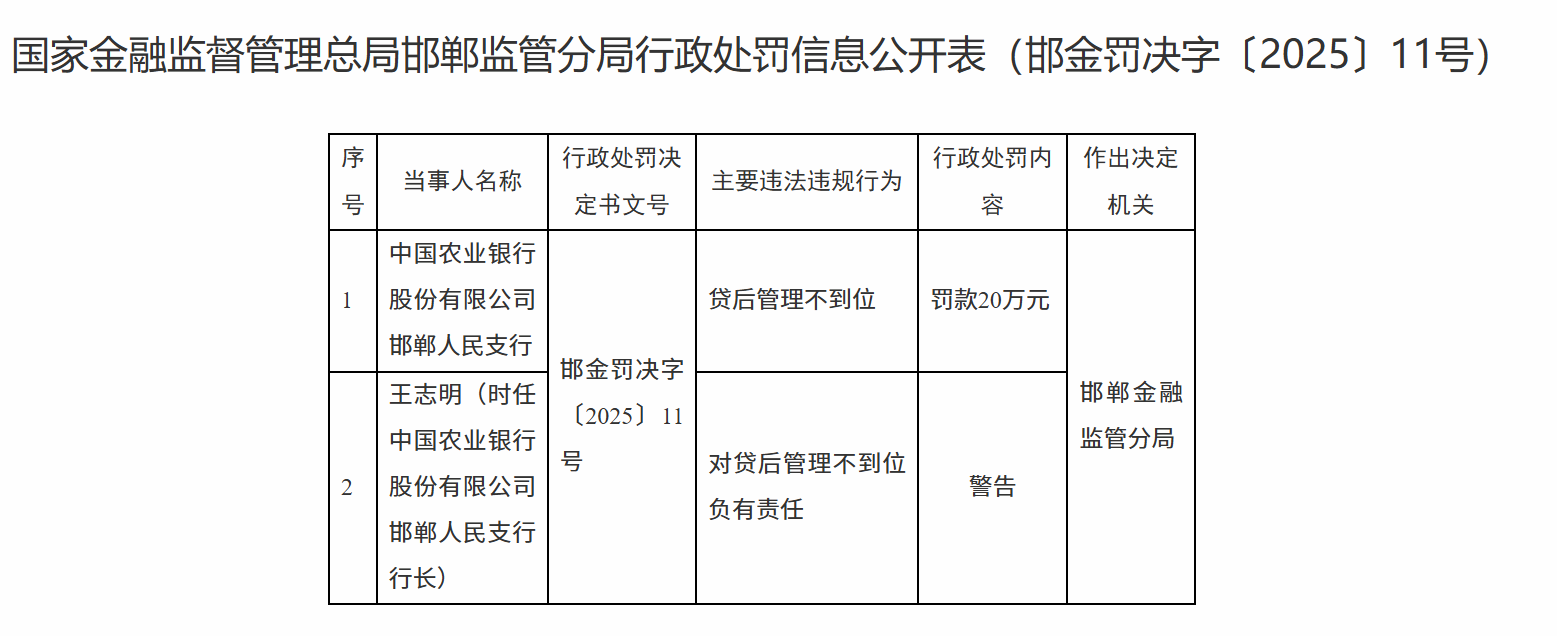 1月6日,国家金融监督管理总局邯郸监管分局行政处罚信息公开表显示,中国农业银行股份有限公司邯郸人民支行因贷后管理不到位被罚款20万元;王某明被警告。