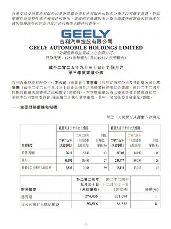 根据吉利汽车发布的第三季度财报,公司当季实现汽车销量76.1万辆,同比增长43%;营业收入达891.92亿元,同比增长27%;归属于上市公司股东的净利润为38.2亿元,同比增长59%。在当前国内汽车市场竞争加剧的背景下,吉利汽车在销量、营收与利润三个维度均保持稳健增长,展现出较强的业务韧性。